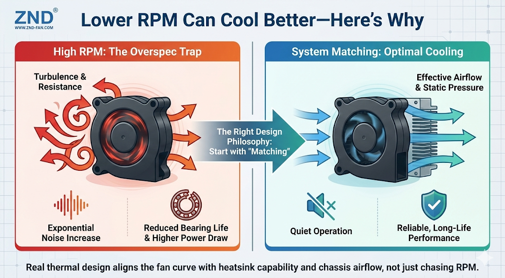 High RPM is one possible means to achieve efficient cooling, but it is never the end goal, nor is it the only path. Discerning engineers understand: The best solution is the one that optimizes total system cost (performance, noise, lifespan, power consumption) while meeting the thermal requirements.