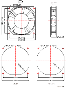 | VDC | Hz | A | W | RPM | dBA | M3/hr | CFM | mmH20 | g | ||