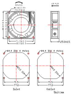 | VDC | Hz | A | W | RPM | dBA | M3/hr | CFM | mmH20 | g | ||