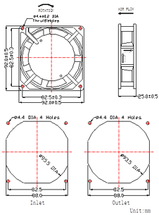 | VDC | Hz | A | W | RPM | dBA | M3/hr | CFM | mmH20 | g | ||